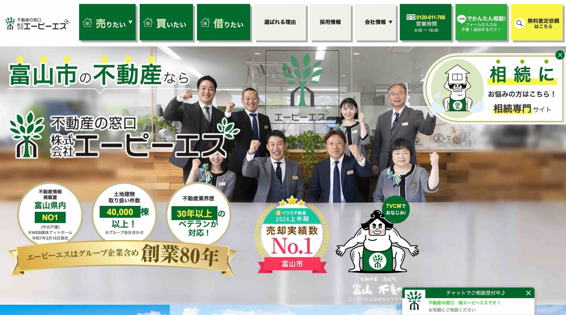 | 強み | 創業80年超。建物の構造・工法に精通した建築のプロが査定。 | 「アパマンショップ」を複数経営。賃貸仲介実績多数。 | 富山・福井の広域に対応。オープンハウスを定期的に実施。 | 宅地分譲から店舗開発支援まで、広範な不動産活用に対応。 | 富山県内の知名度が高い。複雑な物件の買取も相談可能。 |